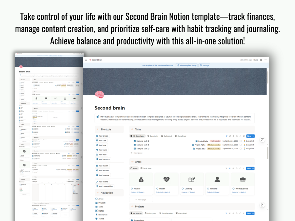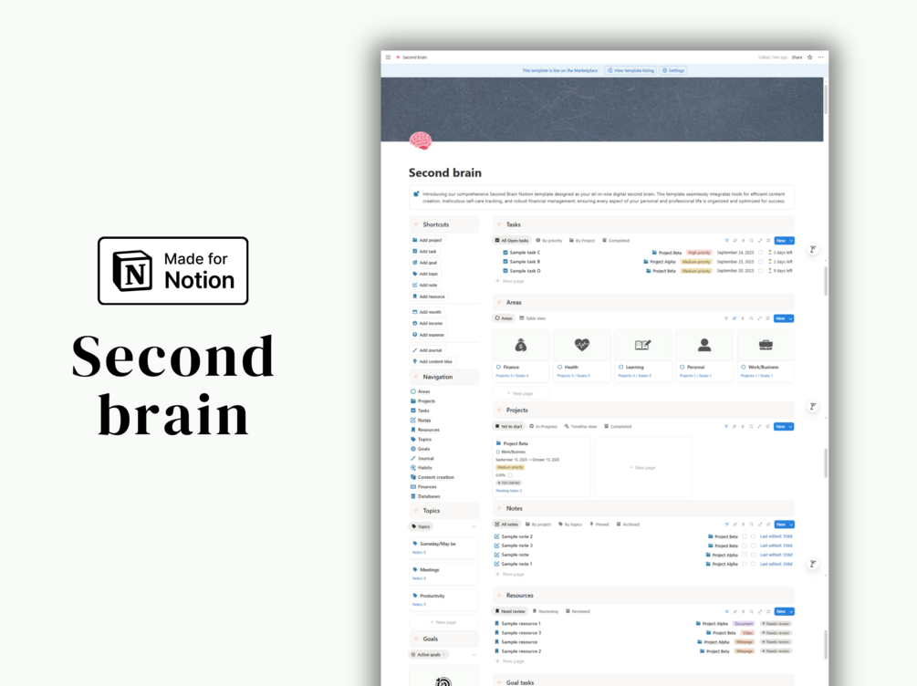 Say hello to the Second Brain Notion Template—your personal command center for staying organized in every part of your life. Whether you're juggling projects, keeping track of your finances, or building healthy habits, this template has everything you need in one place.