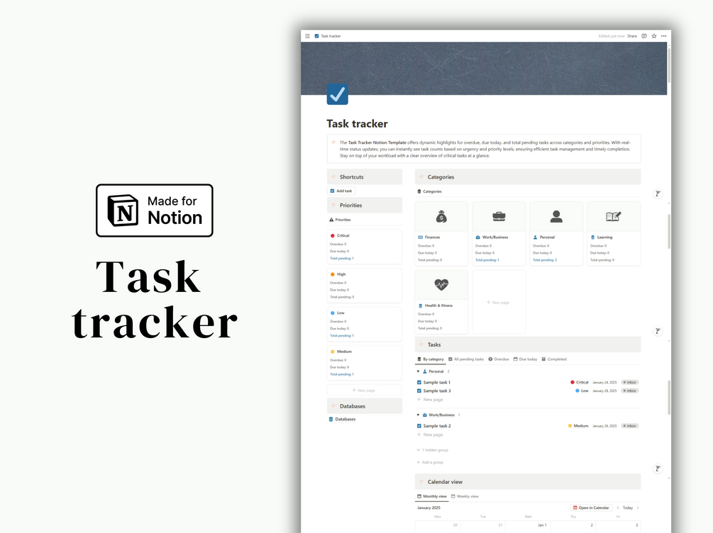 Take control of your productivity with this Smart Task Tracker, the ultimate Notion template for managing your to-do list. This isn't just a simple checklist—it's a dynamic system that helps you prioritize, stay organized, and conquer your goals with clarity and efficiency.