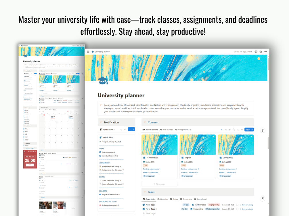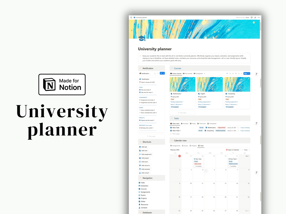 Simplify your university life with the ultimate Notion University Planner, designed to tackle every aspect of your academic journey. From tracking courses and managing semesters to organizing assignments, exams, and projects, this template is packed with features to keep you on top of your studies.